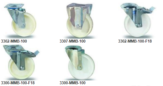 К этой серии относятся колеса отлитые под давлением из полипропилена. Материал устойчив к воздействию водных растворов ряда неорганических соединений, слабых неорганических кислот и щелочей, этилового спирта и некоторых масел и жиров. Диапазон рабочих температур от -10С до +40С. Стандартные поставки осуществляются с подшипником скольжения. Возможны поставки с роликовым подшипником (MMS).