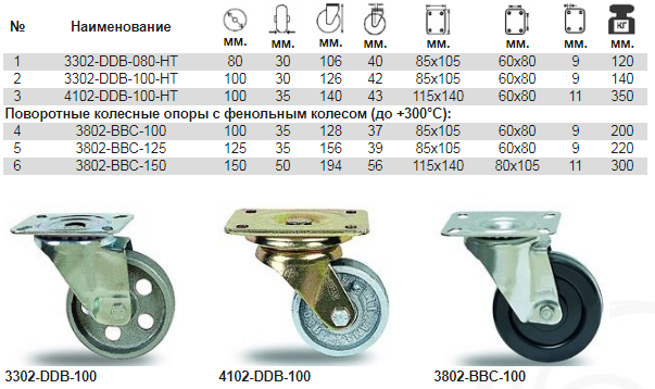 Поворотные колесные опоры с чугунным колесом (до +300°С):