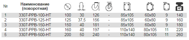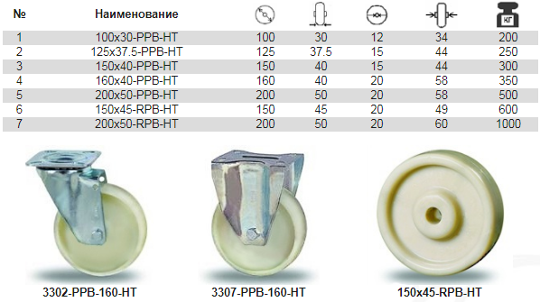 Жаростойкие колеса этой серии отлиты под давлением из высококачественного полиамида с добавлением стеклово-локна. Рабочая температура до +130С, кратковременно до +170С. Колеса устойчивы к воздействию множества агрес-сивных веществ. Обладают низким сопротивлением каче-нию, высокой механической прочностью и износоустойчи-востью. Колеса не требуют ухода и отличаются продолжи-тельным сроком службы. Возможна поставка полутя-желой серии колес RPB-HT повышенной грузоподъемности с усиленной ступицей.